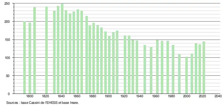 L'évolution du nombre d'habitants est connue à travers les recensements de la population effectués dans la commune depuis 1793. Pour les communes de moins de 10 000 habitants, une enquête de recensement portant sur toute la population est réalisée tous les cinq ans, les populations légales des années intermédiaires étant quant à elles estimées par interpolation ou extrapolation[19]. Pour la commune, le premier recensement exhaustif entrant dans le cadre du nouveau dispositif a été réalisé en 2006[20].