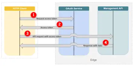 OAuth dans sa version 2.0[1] repose sur des échanges entre quatre acteurs. Le resource owner (utilisateur) est capable d’accorder l’accès à la ressource pour une application client. L’authorization server (serveur d’autorisation) occupe le rôle central au sein du protocole, il est chargé d’authentifier le resource owner et de délivrer son autorisation sous la forme d’un jeton appelé access token. Le resource server quant à lui correspond au serveur où sont stockées les ressources protégées[2].