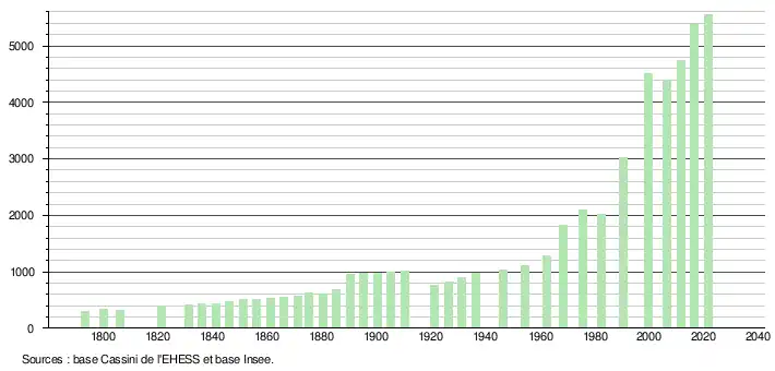 L'évolution du nombre d'habitants est connue à travers les recensements de la population effectués dans la commune depuis 1793. Pour les communes de moins de 10 000 habitants, une enquête de recensement portant sur toute la population est réalisée tous les cinq ans, les populations légales des années intermédiaires étant quant à elles estimées par interpolation ou extrapolation[23]. Pour la commune, le premier recensement exhaustif entrant dans le cadre du nouveau dispositif a été réalisé en 2006[24].