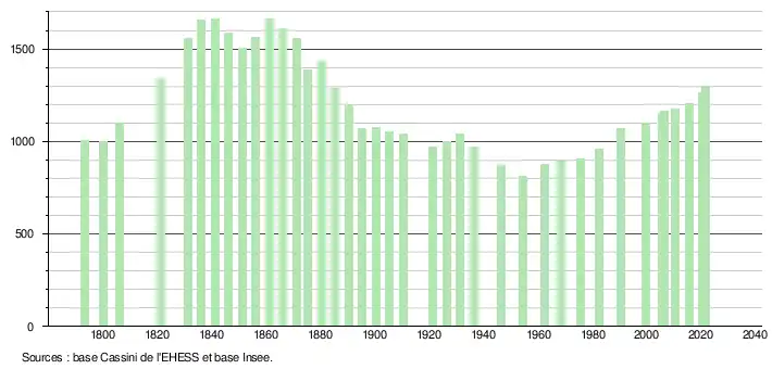 L'évolution du nombre d'habitants est connue à travers les recensements de la population effectués dans la commune depuis 1793. Pour les communes de moins de 10 000 habitants, une enquête de recensement portant sur toute la population est réalisée tous les cinq ans, les populations légales des années intermédiaires étant quant à elles estimées par interpolation ou extrapolation[17]. Pour la commune, le premier recensement exhaustif entrant dans le cadre du nouveau dispositif a été réalisé en 2005[18].