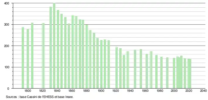 L'évolution du nombre d'habitants est connue à travers les recensements de la population effectués dans la commune depuis 1793. Pour les communes de moins de 10 000 habitants, une enquête de recensement portant sur toute la population est réalisée tous les cinq ans, les populations légales des années intermédiaires étant quant à elles estimées par interpolation ou extrapolation[18]. Pour la commune, le premier recensement exhaustif entrant dans le cadre du nouveau dispositif a été réalisé en 2004[19].