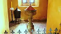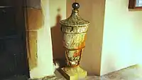 En entrant dans l'église sous l'ancien porche, on trouve deux anciens baptistères qui pourraient avoir fait partie de la première époque de l'église au XIIIe siècle. L'un des deux est un font baptismal en grès gris dont la une cuve est remontée sur un pied qui pourrait date de 1717.