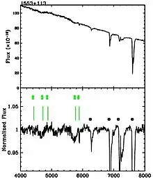 Cependant, la variation des objets BL Lac ne doit pas être reliée à celle des quasars à spectre radio plat (FSRQ pour Flat Spectrum Radio Quasar) mais elle pourrait être originaire du même principe que la variation des quasars variables optiquement violents. Les spectres optiques/UV des FSRQ sont caractérisés par la présence de larges raies d'émission ainsi que des raies étroites ; les objets BL Lac sont plutôt dominés par l'émission continue dans la bande optique et ne montrent que dans de très rare cas la présence de raies, tant en absorption qu'en émission. Les objets BL Lac peuvent être subdivisés en sources de pointe à haute, moyenne et basse énergie (HBL pour High-energy BL Lac, IBL pour Intermediate BL Lac et LBL pour Low-energy BL Lac, respectivement), en fonction de la position de leurs fréquences de pointe synchrotron sur leur distribution spectrale d'énergie. La distribution d'énergie spectrale à large raie des blazars a une structure caractéristique en double bosse. La première bosse s'étend de la gamme des ondes radio jusqu'aux gammes des longueurs optiques, et est due à l'émission synchrotron d'électrons de jet accélérés, et la deuxième bosse est située dans la partie des rayons γ du spectre et est largement considérée comme étant en raison de l'émission Compton inversée, lorsque des électrons relativistes libres entrent en collision avec des photons dits « incidents »[8].