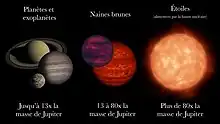 Par cette définition, les objets substellaires regroupent les objets de masse planétaire (de masse inférieure à 13 MJ), les naines brunes (de masse comprise entre 13 et 85 MJ), ainsi que les résidus d'étoiles, tels que EF Eridani B, de masse inférieure à 85 MJ[2],[3],[4].