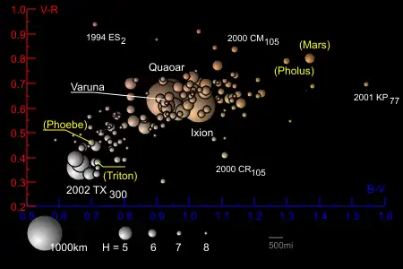 L'indice de couleur est la mesure des différences de magnitude apparente de l’objet vu à travers des filtres bleu (B), neutre (V; vert-jaune) et rouge (R). Le graphe représente les indices connus des transneptuniens à l’exception des plus grands. Pour la comparaison, deux lunes Triton et Phœbé, le centaure Pholos et la planète Mars sont aussi représentés (il s'agit des noms en jaune, la taille n'est pas à l’échelle !).