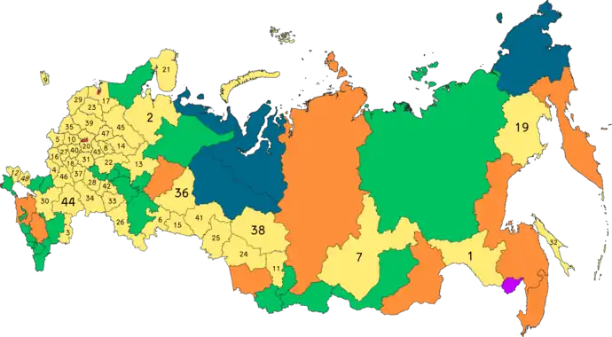 Jaune : oblast — Vert : république — Orange : kraï — Violet : oblast autonome — Rouge : ville fédérale — Bleu : okroug autonome -Hachuré : occupation de l'Ukraine