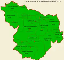 Le , les 11 districts de la région autonome tchétchène ont été transformés en districts et à partir de 1932, l'oblast est divisé en une ville, Grozny et en 12 districts.