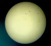 Projection du Soleil dans un Solarscope. Le ciel n'était pas très pur, mais on y voit, (dans le quart inférieur droit) la tache solaire 1092[5] ().