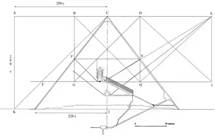 - Chambre du roi. Le niveau du sol se situe à 82 coudées. Le niveau des points d'intersection F et E des conduits avec le revêtement de la pyramide est à 154 coudées. La distance entre F et E vaut 2×(220 – 154×11/14) = 198 coudées, valeur de BG (distance entre le sommet de la pyramide et le sol de la chambre du roi). La diagonale du plan du niveau de la chambre du roi vaut 2×(220 – 82×11/14):sin(45°) = 440 coudées, valeur des côtés de la base de la pyramide. Le conduit nord à une pente de 7/11, valeur de la pente de la diagonale EL d'un rectangle ayant comme hauteur la distance du sommet de la pyramide jusqu'à l'intersection des conduits (126 coudées) et comme base 198 coudées.
