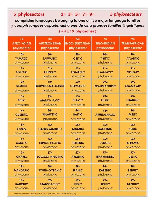 Bien que les secteurs fournissent une division naturelle du monde linguistique en dix parties, exploitable pour la commodité d’un référencement numérique, il est évident que leur sous-division ultérieure en 10 x 10 zones a nécessité des variations quantitatives entre ces zones, en ce qui concerne leur complexité linguistique relative. Toutefois, les variations de proximité linguistique parmi les langues de chaque géozone ou phylozone sont mesurées et présentées en termes d’une échelle alphabétique complémentaire à la clef (voir ci-dessous).