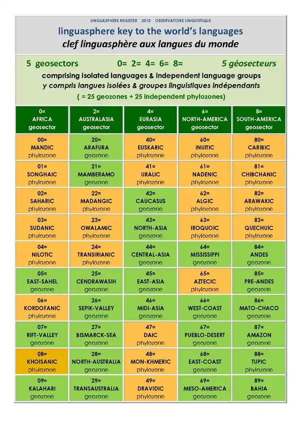 Le « Registre Linguasphère » divise ainsi le monde en dix tiroirs conventionnels, ou secteurs de référence, à l’intérieur desquels chaque langue trouve sa place : dans l’une des cinq catégories linguistiques ou phylozones, ou dans l’une des cinq catégories géographiques pour les autres. Le premier chiffre de son code Linguasphère représente donc le secteur de référence de toute langue, de tout groupement de langues ou de toute variété linguistique.