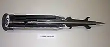 Écorché d'un obus-flèche 3BM15 de 125 mm. Entré en dotation en 1972, il est intégralement en acier maraging à l'exception de son noyau en carbure de tungstène.