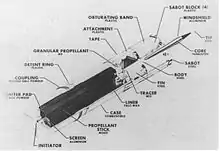 La flèche, largement sous-calibrée, est maintenue par un sabot de lancement engagé dans la douille, au départ du coup, ce sabot communique la poussée des gaz à la flèche mais grâce à une ceinture dérapante, ne lui transmet qu'une faible partie de la rotation engendrée par les rayures du canon.