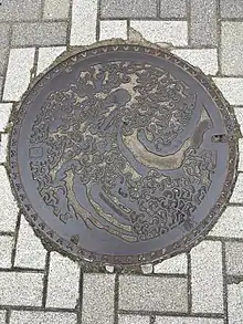 Une plaque d'égout reproduisant la Vague masculine de l'artiste japonais Hokusai dans le bourg d'Obuse. Hokusai a vécu de 1842 à 1846 dans ce bourg où un musée lui est consacré[1]