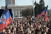 La république de Donetsk est d'abord le nom d'une organisation active à partir de et ayant pour projet l'autonomie territoriale de l'oblast de Donetsk[14]. L'idée d'un référendum sur l'avenir de l'oblast de Donetsk dans le contexte du conflit russo-ukrainien est lancée notamment par Pavel Goubarev, gouverneur choisi à main levée par les manifestants de Donetsk en  ; il est arrêté trois jours plus tard par le service de sécurité d'Ukraine (SBU) ukrainien et libéré en , en échange de prisonniers des forces « Alpha ». Entre-temps a lieu le référendum d'autodétermination de la Crimée, le .
