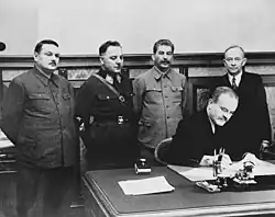 Le 22 juin 1941, débute l'opération Barbarossa, qui donne le coup d'envoi du front de l'Est. Les pays allemands de l'Axe européen et la Finlande envahissent l'URSS, mettant ainsi fin au traité de non-agression germano-soviétique. Pendant les hostilités entre l'Union soviétique et l'Axe, qui conduisent à la défaite militaire totale de ce dernier, l'URSS occupe totalement ou partiellement le territoire de l'Allemagne et de ses satellites, ainsi que les territoires de certains États occupés par l'Allemagne et de l'Autriche. Certains d'entre eux deviennent des États satellites soviétiques, à savoir la république populaire de Pologne, la république populaire de Hongrie[33], la République socialiste tchécoslovaque[34], la République populaire roumaine, la république populaire de Bulgarie, la république populaire d'Albanie[35]; plus tard, l'Allemagne de l'Est est formée sur la base de la zone soviétique d'occupation allemande[36].
