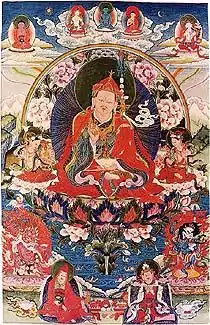 Padmasambhava est le fondateur du Bouddhisme tibétain et le Second Bouddha pour l'école Nyingmapa. Contrairement à Indrabhuti (en), son existence historique est prouvée. En effet, un texte prouvant l'existence de Padmasambhava a été trouvé par Paul Pelliot dans les Grottes de Mogao à Dunhuang. Il est conservé aujourd'hui à Bibliothèque nationale de France. Ce texte du IXe siècle explique qu'un maître bouddhiste indien Padmasambhava vint au Tibet y enseigner le Dharma et la pratique de Vajrakilaya[13],[14]. D'après la tradition tibétaine, Padmasambhava apparut de façon miraculeuse dans un lotus au centre du lac Dhanakosha en Oddiyana. Le roi Indrabhuti (en) l'aurait alors adopté. Padmasambhava passa ensuite de nombreuses années en Inde avant d'aller au Tibet à la demande du roi tibétain Trisong Detsen (v. 704-797). Il est donc possible que Padmasambhava soit bien né en Oddiyana au VIIIe siècle et qu'Indrabhuti (en) était le nom du roi de ce pays bouddhiste tel que l'archéologie nous le montre.