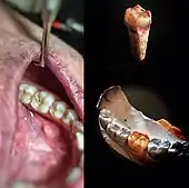 - La technique indirecte consiste à prendre l'empreinte de la cavité que l'on veut obturer, le prothésiste fabrique ensuite la pièce juste manquante. Les matériaux pouvant être utilisés sont : les métaux et alliages métalliques (or, nickel-chrome, chrome-cobalt), la résine cuite, la céramique (ou porcelaine). La pièce issue de cette technique s'appelle un inlay. Quand la cavité est très grosse et que des parties entières de dents sont à reconstruire, on les appelle onlay. Cette technique a comme avantage d'être très pérenne, très satisfaisante esthétiquement (sauf quand le matériau utilisé est métallique), mais extrêmement onéreuse (de 10 à 20 fois le prix d'une restauration par technique directe).