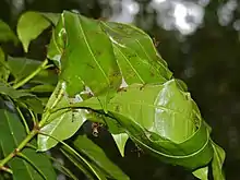 Nid de fourmis tisserandes fait de feuilles vertes soudées ensemble. Avril 2018.