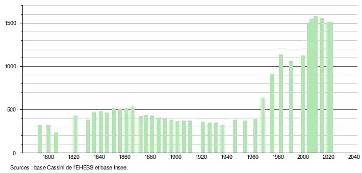 L'évolution du nombre d'habitants est connue à travers les recensements de la population effectués dans la commune depuis 1793. Pour les communes de moins de 10 000 habitants, une enquête de recensement portant sur toute la population est réalisée tous les cinq ans, les populations légales des années intermédiaires étant quant à elles estimées par interpolation ou extrapolation[28]. Pour la commune, le premier recensement exhaustif entrant dans le cadre du nouveau dispositif a été réalisé en 2004[29].