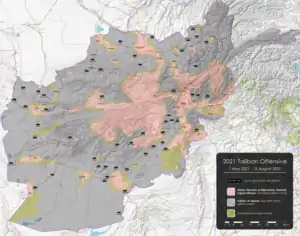 Entre le et le , les talibans prennent 228 districts au gouvernement afghan, lequel finit par s'effondrer. Le 15 août 2021, ils entrent dans Kaboul sans combattre et reprennent le pouvoir vingt ans après en avoir été chassés.