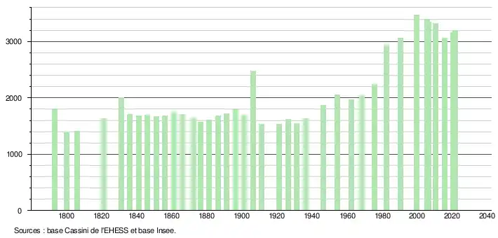 L'évolution du nombre d'habitants est connue à travers les recensements de la population effectués dans la commune depuis 1793. Pour les communes de moins de 10 000 habitants, une enquête de recensement portant sur toute la population est réalisée tous les cinq ans, les populations légales des années intermédiaires étant quant à elles estimées par interpolation ou extrapolation[26]. Pour la commune, le premier recensement exhaustif entrant dans le cadre du nouveau dispositif a été réalisé en 2005[27].