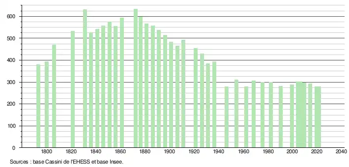 L'évolution du nombre d'habitants est connue à travers les recensements de la population effectués dans la commune depuis 1793. Pour les communes de moins de 10 000 habitants, une enquête de recensement portant sur toute la population est réalisée tous les cinq ans, les populations légales des années intermédiaires étant quant à elles estimées par interpolation ou extrapolation[24]. Pour la commune, le premier recensement exhaustif entrant dans le cadre du nouveau dispositif a été réalisé en 2004[25].