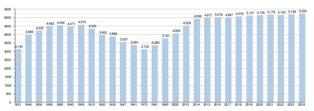 Elle comptait, au dernier comptage, 5 228 habitants (2 638 hommes et 2 590 femmes), soit une densité de 92,24 habitants/km²[2] pour une superficie de 56,68 km².