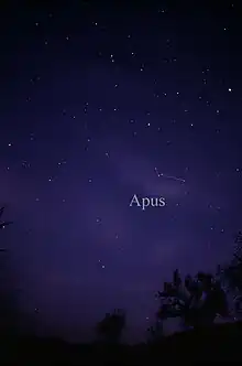 La plus brillante étoile de la constellation de l’Oiseau du Paradis est α Apodis, une géante rouge de magnitude apparente 3,80, distante de 410 années-lumière. Cinq fois plus massive que le Soleil, elle s’étend sur près de la moitié d’une ua.