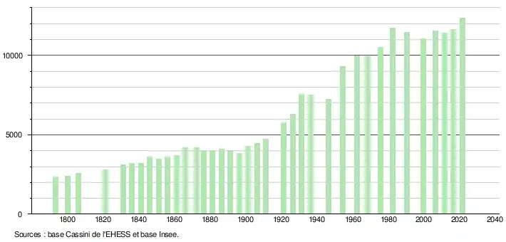 - Par convention dans Wikipédia, le principe a été retenu de n’afficher dans le tableau des recensements et le graphique, pour les populations légales postérieures à 1999, que les populations correspondant à une enquête exhaustive de recensement pour les communes de moins de 10 000 habitants, et que les populations des années 2006, 2011, 2016, etc. pour les communes de plus de 10 000 habitants, ainsi que la dernière population légale publiée par l’Insee pour l'ensemble des communes.