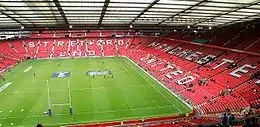 Old Trafford accueille régulièrement des matchs de rugby, nationaux et internationaux, le plus souvent du rugby à XIII, très populaire dans le nord de l'Angleterre. Le premier match de rugby joué à Old Trafford est un match de rugby à XIII entre une équipe représentant le Lancashire et l'équipe de Nouvelle-Zélande. Le match a lieu durant la saison 1924-1925 de football mais Manchester United, alors en seconde division, accepte de prêter son stade en échange de 20 % de la recette du match[12]. Le premier match de "rugby league" de championnat au « théâtre des rêves » est un match entre Salford et Leeds en novembre 1958 sous les projecteurs et devant 8 000 spectateurs[60]. Le premier test match a lieu en 1986, lorsque l'Australie bat la Grande-Bretagne 38-16 sous les yeux de 50 583 spectateurs[61],[62]. L'édition 1989 du World Club Challenge est jouée le à Old Trafford. Cette compétition voit Widnes battre les Canberra Raiders 30-18[63]. En 2000, la Grande-Bretagne, l'Irlande et la France organisent la coupe du monde de rugby à XIII. Elles choisissent de jouer la finale de l'édition à Old Trafford. L'Australie et la Nouvelle-Zélande s'y disputent le titre lors de cette finale remportée par l'Australie sur un score de 40-12 devant 44 329 spectateurs[64]. En novembre 2013, la finale de la Coupe du monde se déroule à nouveau à Old Trafford entre l'Australie et la Nouvelle-Zélande (34-2). C'est l'occasion pour le rugby à XIII d'y établir un record de spectateurs (74 468) pour un match international disputé en Grande-Bretagne. Par ailleurs, le « théâtre des rêves » accueille chaque année la finale de la Super League de rugby à XIII depuis la mise en place des play-offs en 1998, réunissant environ 70 000 spectateurs et dont le record de 72 582 spectateurs réalisé en 2006 entre St Helens RLFC et Hull FC[65],[66] a été battu en 2015 avec 73 512 spectateurs pour le match Leeds - Wigan. En 2017, 72 827 spectateurs ont assisté à la "Grand Final" Leeds - Castelford.