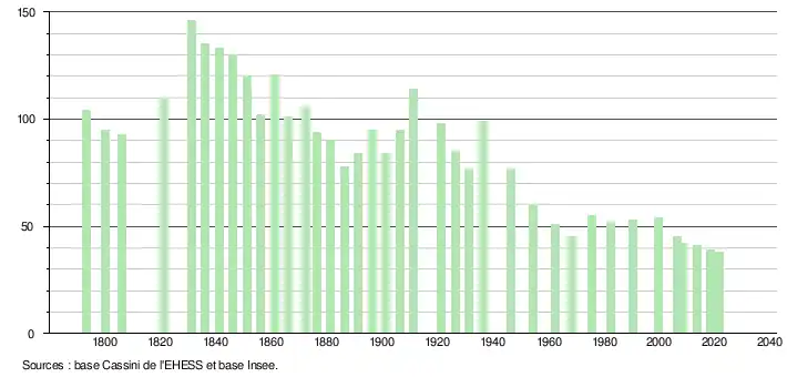 L'évolution du nombre d'habitants est connue à travers les recensements de la population effectués dans la commune depuis 1793. Pour les communes de moins de 10 000 habitants, une enquête de recensement portant sur toute la population est réalisée tous les cinq ans, les populations légales des années intermédiaires étant quant à elles estimées par interpolation ou extrapolation[14]. Pour la commune, le premier recensement exhaustif entrant dans le cadre du nouveau dispositif a été réalisé en 2008[15].