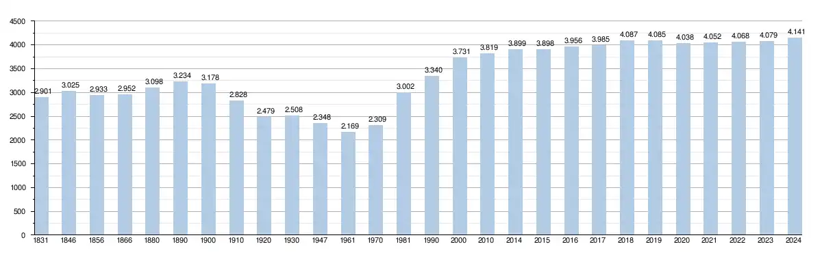 Elle comptait, au , 4 130 habitants (2 060 hommes et 2 070 femmes) [13], soit une densité de 257,48 habitants/km² pour une superficie de 16,04 km²[14].