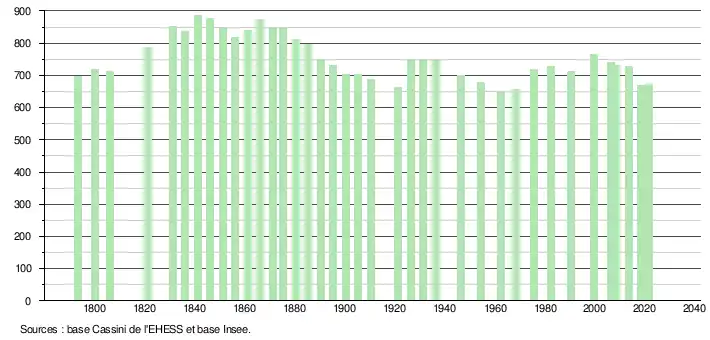 L'évolution du nombre d'habitants est connue à travers les recensements de la population effectués dans la commune depuis 1793. Pour les communes de moins de 10 000 habitants, une enquête de recensement portant sur toute la population est réalisée tous les cinq ans, les populations légales des années intermédiaires étant quant à elles estimées par interpolation ou extrapolation[16]. Pour la commune, le premier recensement exhaustif entrant dans le cadre du nouveau dispositif a été réalisé en 2008[17].