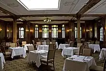 L'Olympic est le paquebot le plus luxueux de son temps. Il propose de nombreuses prestations à ses passagers dont certaines sont assez originales sur un paquebot. Les passagers de première classe ont ainsi accès sur le pont A à un vaste salon de style Louis XV où joue régulièrement l'orchestre du navire[a 59], dans lequel est ajouté à la fin des années 1920 un projecteur de cinéma[a 49]. Au même pont se trouve un somptueux salon de lecture et de correspondance orné de grandes baies vitrées, un fumoir décoré de boiseries d'acajou, de vitraux, et d'une cheminée surmontée d'un tableau du peintre Norman Wilkinson, L'arrivée au Nouveau Monde[a 60]. Sur le pont supérieur, les passagers ont accès à un gymnase pourvu de tous les appareils récents (machines à ramer, à pédaler, chevaux et chameaux électriques)[48]. Le pont A accueille également deux cafés véranda décorés de palmiers. Le navire propose également un restaurant à la carte et une vaste salle à manger (agrémentée d'une piste de danse dans les années 1920[a 49]). Le navire offre également à ces passagers un accès à des bains turcs et une piscine, nouveauté apparue en 1907 sur l'Adriatic[a 61]. Il est également pourvu d'un court de squash.
