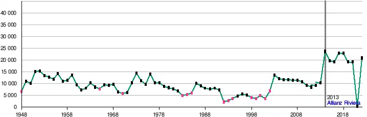 108. « Historique des affluences de l'OGC Nice », sur stades-spectateurs.com (consulté le ).