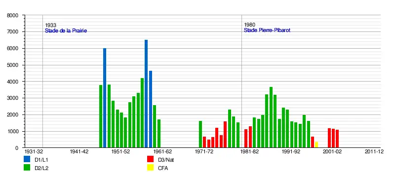 Le record d’affluence dans le stade Pierre-Pibarot, anciennement stade de la Prairie, est de 17 000 spectateurs à deux reprises, lors du derby face au Nîmes Olympique en 1950, et lors de la demi-finale aller de la Coupe de France le face aux Girondins de Bordeaux (2-2)[12].