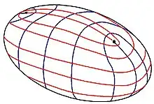 représentation des lignes de courbures d'un ellipsoïde, montrant les ombilics comme points singuliers d'une des séries de lignes (points de Darboux)