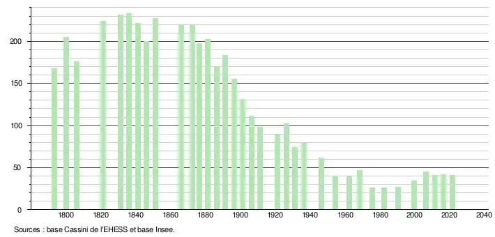 L'évolution du nombre d'habitants est connue à travers les recensements de la population effectués dans la commune depuis 1793. Pour les communes de moins de 10 000 habitants, une enquête de recensement portant sur toute la population est réalisée tous les cinq ans, les populations légales des années intermédiaires étant quant à elles estimées par interpolation ou extrapolation[20]. Pour la commune, le premier recensement exhaustif entrant dans le cadre du nouveau dispositif a été réalisé en 2006[21].