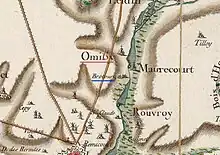 La carte de Cassini ci-contre montre qu'au milieu du XVIIIe siècle, Omissy est une paroisse située sur la rive droite de la Somme. Une importante retenue d'eau avait été créée pour faciliter la pêche. Au sud, le hameau de Brocourt, qui s'était appelé Brovecurt en 1110, Molendium de Brocourt puis Braulcourt et qui comportait deux fermes qui avaient autrefois appartenu à l'abbaye de Saint-Prix, appartenait à Omissy[17]. Avec les nombreuses habitations qui se sont implantées, la ferme de Brocourt est de nos jours reliée au village.