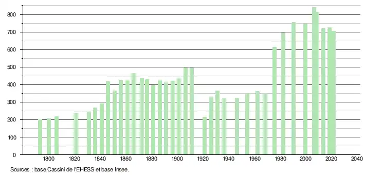 L'évolution du nombre d'habitants est connue à travers les recensements de la population effectués dans la commune depuis 1793. Pour les communes de moins de 10 000 habitants, une enquête de recensement portant sur toute la population est réalisée tous les cinq ans, les populations légales des années intermédiaires étant quant à elles estimées par interpolation ou extrapolation[38]. Pour la commune, le premier recensement exhaustif entrant dans le cadre du nouveau dispositif a été réalisé en 2008[39].