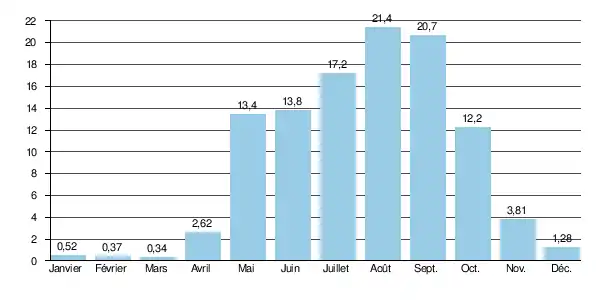 Le débit moyen mensuel observé en mars (minimum d'étiage) est de 0,34 m3/s, soit à peine 2 % du débit moyen du mois d'août (21,4 m3/s), ce qui témoigne de l'énorme amplitude des variations saisonnières. Sur la durée d'observation de 44 ans, le débit mensuel minimal a été de 0,02 m3/s en (20 litres), tandis que le débit mensuel maximal s'élevait à 68,1 m3/s en .