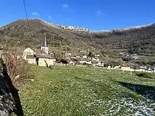 Vue générale d'Oncieu, mettant en évidence la forme circulaire du village. | |||||