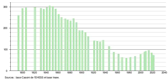 L'évolution du nombre d'habitants est connue à travers les recensements de la population effectués dans la commune depuis 1793. Pour les communes de moins de 10 000 habitants, une enquête de recensement portant sur toute la population est réalisée tous les cinq ans, les populations légales des années intermédiaires étant quant à elles estimées par interpolation ou extrapolation[21]. Pour la commune, le premier recensement exhaustif entrant dans le cadre du nouveau dispositif a été réalisé en 2008[22].