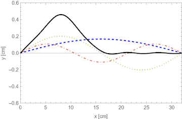 On peut utiliser ce résultat pour trouver l'évolution de n'importe que état initial d'une corde avec des petits déplacements transverses, comme illustré ci-contre pour un état initial correspondant à une excitation dite de "mode harmonique".