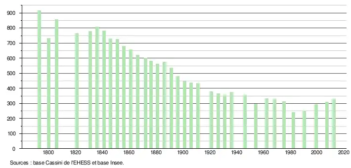 L'évolution du nombre d'habitants est connue à travers les recensements de la population effectués dans la commune depuis 1793. À partir du , les populations légales des communes sont publiées annuellement dans le cadre d'un recensement qui repose désormais sur une collecte d'information annuelle, concernant successivement tous les territoires communaux au cours d'une période de cinq ans. Pour les communes de moins de 10 000 habitants, une enquête de recensement portant sur toute la population est réalisée tous les cinq ans, les populations légales des années intermédiaires étant quant à elles estimées par interpolation ou extrapolation[8]. Pour la commune, le premier recensement exhaustif entrant dans le cadre du nouveau dispositif a été réalisé en 2007[9],[Note 2].