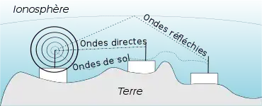 En dehors des courtes distances pour lesquelles on profite de l'onde du sol, les ondes décamétriques se propagent par réflexions successives entre le sol ou la mer et les couches E, F, F1 et F2 [29].