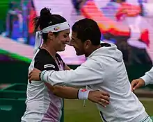 Fin juin, elle dispute Wimbledon et remporte son premier match contre Rebecca Peterson (6-2, 6-1)[52]. Elle élimine ensuite l'Américaine Venus Williams, quintuple vainqueure du tournoi (7-5, 6-0)[53], puis Garbiñe Muguruza, douzième mondiale en trois sets (5-7, 6-3, 6-2)[54], devenant la première femme arabe qualifiée en huitièmes de finale à Wimbledon[55]. Elle renverse ensuite la Polonaise Iga Świątek, septième joueuse mondiale en trois sets (5-7, 6-1, 6-1)[56] et atteint le deuxième quart de finale en Grand Chelem de sa carrière, le premier à Wimbledon. Elle plie lors du match suivant contre la Biélorusse Sabalenka (4-6, 3-6) pour la deuxième fois de l'année[57].