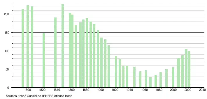 L'évolution du nombre d'habitants est connue à travers les recensements de la population effectués dans la commune depuis 1793. Pour les communes de moins de 10 000 habitants, une enquête de recensement portant sur toute la population est réalisée tous les cinq ans, les populations légales des années intermédiaires étant quant à elles estimées par interpolation ou extrapolation[19]. Pour la commune, le premier recensement exhaustif entrant dans le cadre du nouveau dispositif a été réalisé en 2007[20].