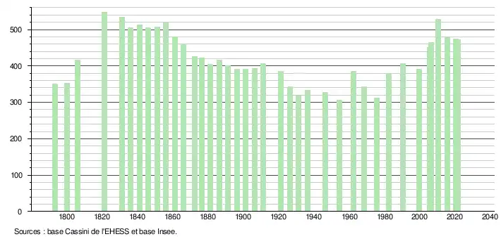 L'évolution du nombre d'habitants est connue à travers les recensements de la population effectués dans la commune depuis 1793. Pour les communes de moins de 10 000 habitants, une enquête de recensement portant sur toute la population est réalisée tous les cinq ans, les populations légales des années intermédiaires étant quant à elles estimées par interpolation ou extrapolation[23]. Pour la commune, le premier recensement exhaustif entrant dans le cadre du nouveau dispositif a été réalisé en 2005[24].